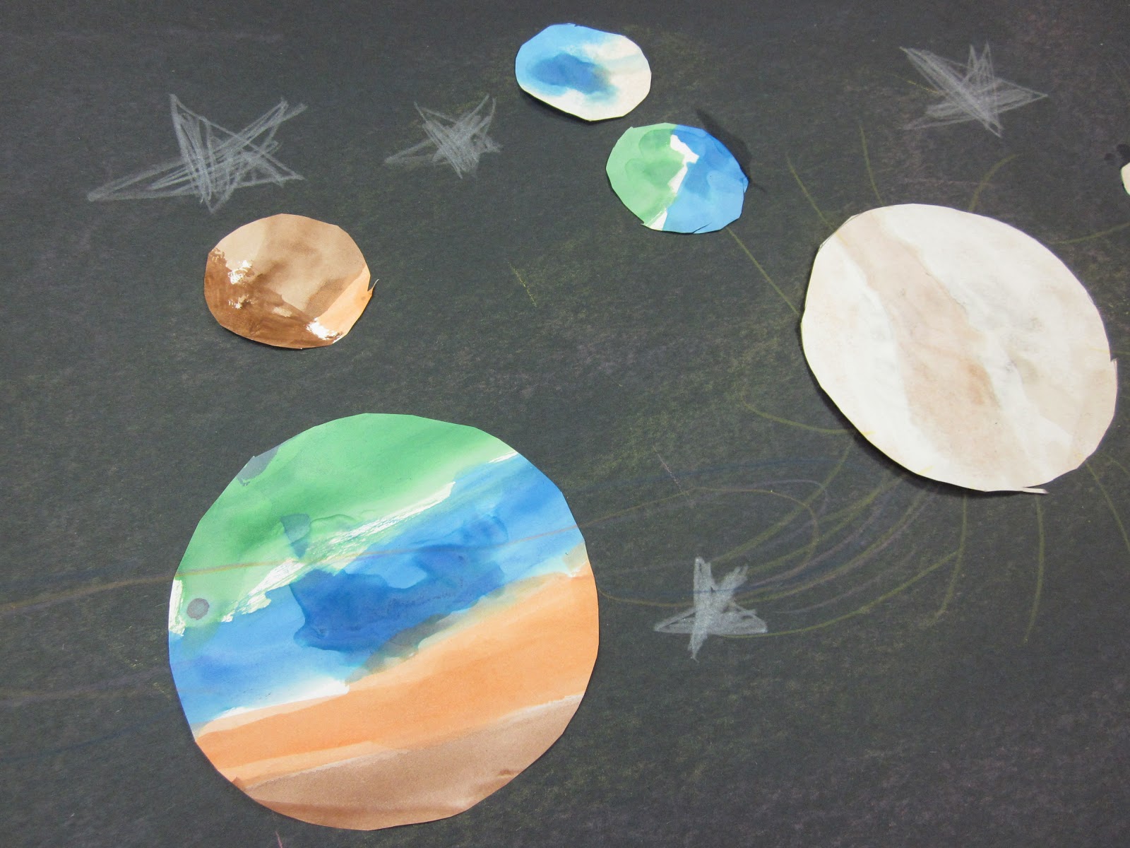 Once I pull out the black paper and we start talking about the milky way, and stars, they sort of see a space project. It isn't til I hold up the painted paper to the light that they can see the colors in their circles! That's when the OOOHs start!